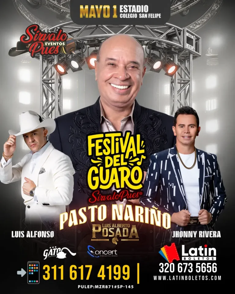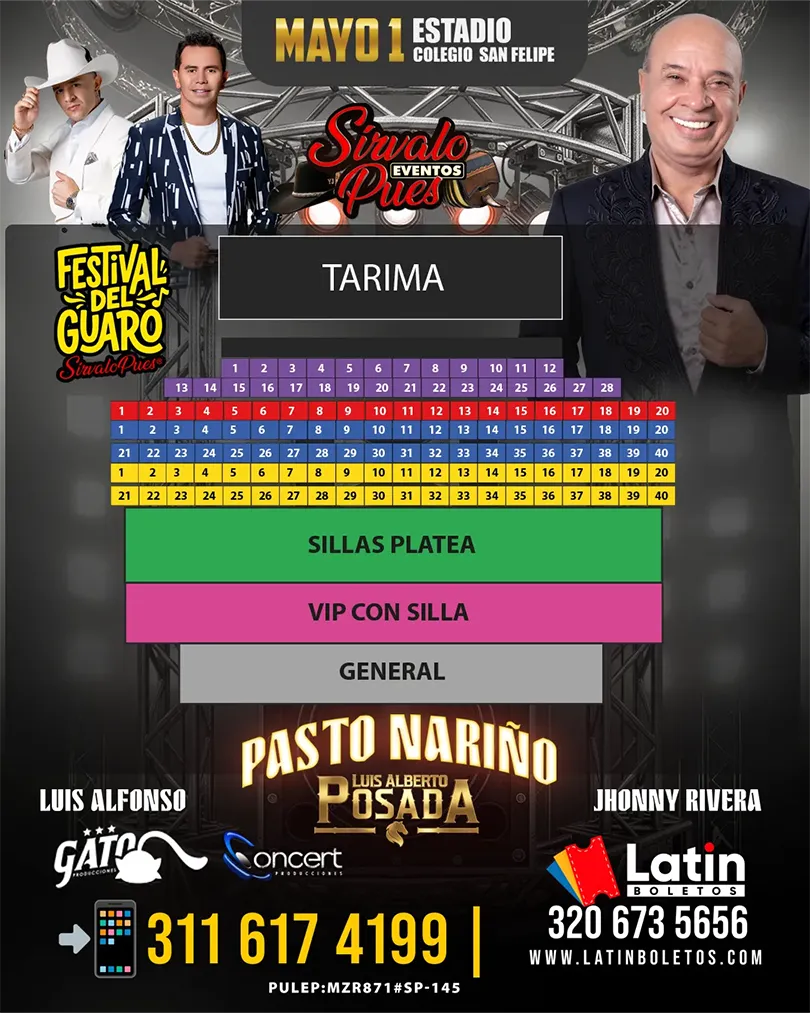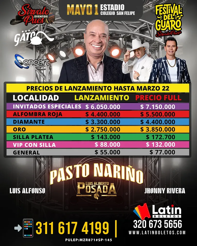 Festival del Guaro – Pasto Pasto mayo 1 viernes 2026 7:00 pm Ingreso: 5:00 pm Artistas Luis Alberto Posada Luis Alfonso Jhonny Rivera mayo 1 viernes 2026 Faltan: Días Horas para el evento Precios Localidad ETAPA ACTUAL Precio Full Invitados Especiales $6.050.000 $7.150.000 Alfombra Roja $4.400.000 $5.500.000 Diamante $3.300.000 $4.400.000 Oro $2.750.000 $3.850.000 Silla Platea $143.000 $172.000 VIP con silla $88.000 $132.000 General $55.000 $77.000 Localidades Lugar Sitio: Estadio Colegio San Felipe Dirección: a 26-48, Dg. 5a Sur #26-2, Pasto, Nariño Información general Eventos Sirvalo Pues PULEP: MZR871#SP-145 Evento Destacado marzo 14 sábado 2026 SOLD OUT! Bucaramanga El Festival del Guaro – Bucaramanga Comprar boletería Otros eventos marzo 14 sábado 2026 SOLD OUT! Cali Festival del Guaro – Cali Comprar boletería marzo 14 sábado 2026 SOLD OUT! Bucaramanga El Festival del Guaro – Bucaramanga Comprar boletería marzo 28 sábado 2026 SOLD OUT! Cúcuta Homenaje al Aventurero – Cúcuta Comprar boletería abril 18 sábado 2026 SOLD OUT! Armenia Posada 50 Años de Historia Musical Comprar boletería Todos los eventos