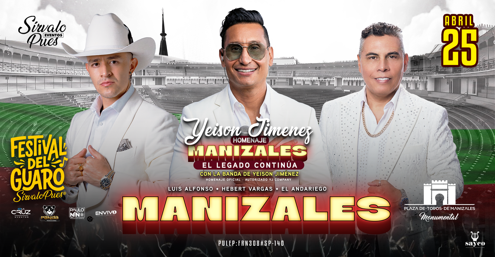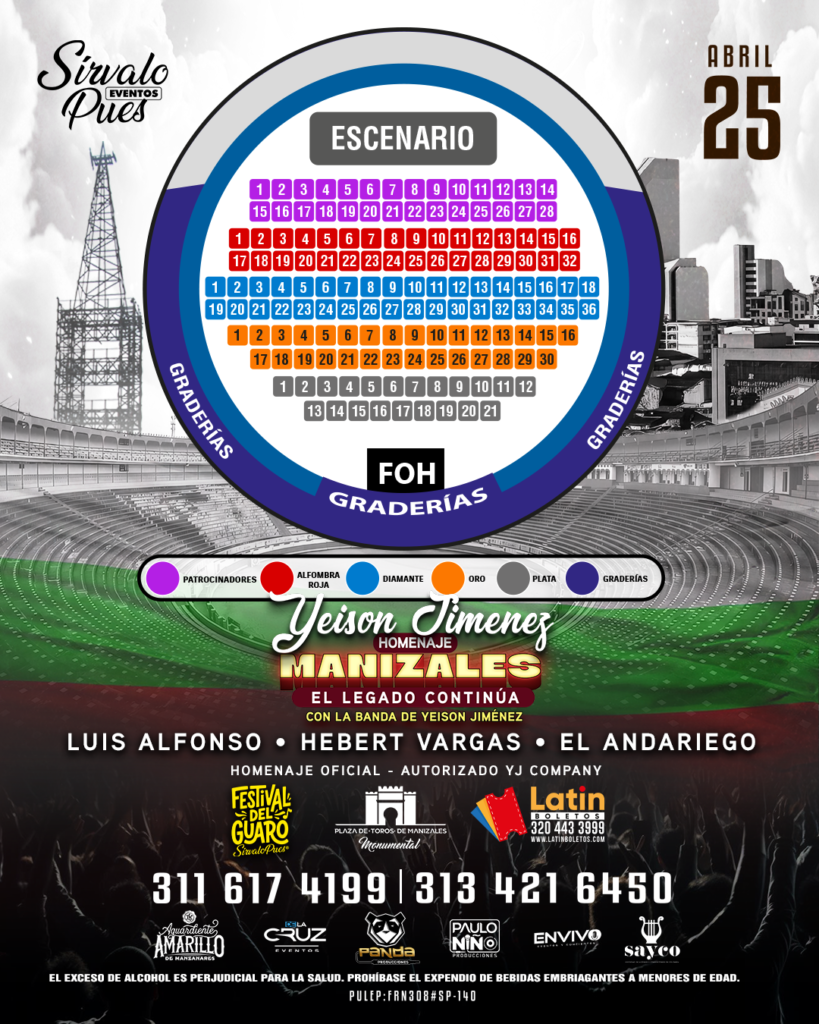 Lugar : Plaza de toros la Monumental Manizales Direccion: Cra. 27 #10A-07, Manizales Fecha: Sabado 09 de Agosto Apertura de Puertas: 5:00pm Edad Minima: 18 Años Responsable: Eventos Sirvalo Pues S.A.S Nit: 901.447.521-3 PULEP: JSS741